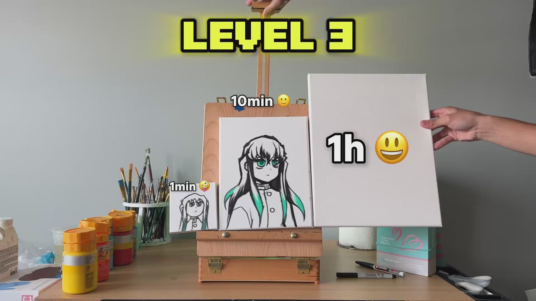 Part of a unique YouTube painting challenge, this original acrylic artwork captures Muichiro Tokito, the Mist Hashira from Demon Slayer: Kimetsu no Yaiba, at the 1-hour stage of a progressive painting challenge — starting from 1 minute up to 100 hours. This piece reflects more detail, refinement, and nuance than the initial 10-minute version, showcasing how skill and patience transform the artwork over time. Fans of Muichiro and collectors of process-based art will value the evolution story behind this painting.